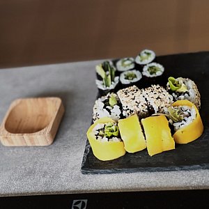 poprawnie układać zestawy sushi na talerzach lub drewnianych deskach,