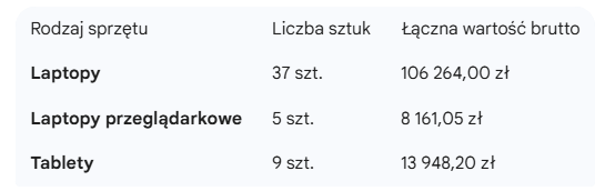 Przekazany sprzęt został dobrany tak, aby wspierać różne formy pracy - od klasycznych zadań projektowych po pracę w chmurze i aplikacjach mobilnych. Wykaz urządzeń przekazanych gminie prezentuje się następująco: