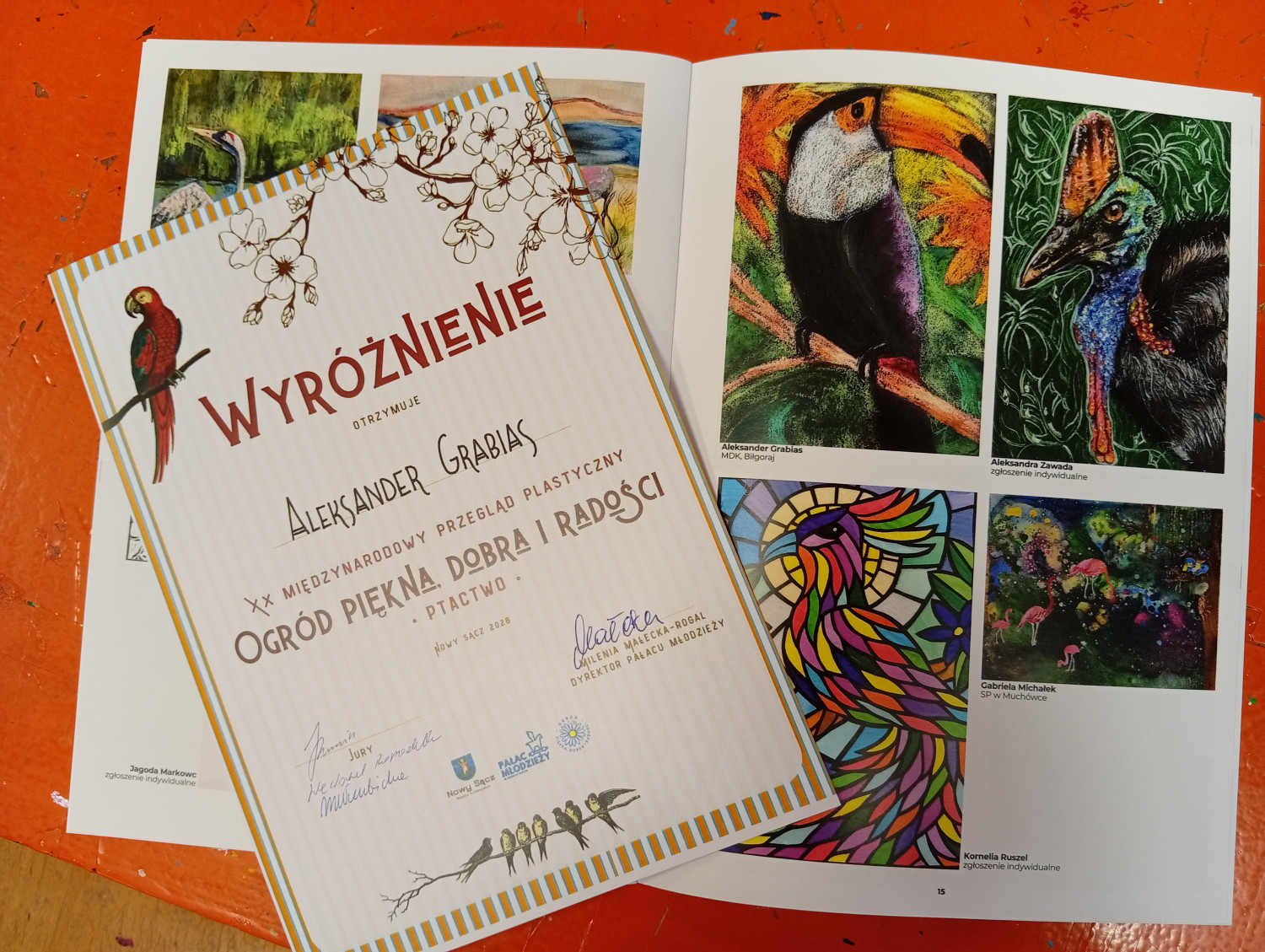 Uczestniczki zajęć plastycznych z najstarszej grupy "Tęczowej Malarni" oraz ich młodszy kolega otrzymali dyplomy i pięknie wydane katalogi nagrodzonych prac w XX Jubileuszowej edycji Międzynarodowego Przeglądu Plastycznego pn. „OGRÓD PIĘKNA, DOBRA I RADOŚCI”, który odbył się w Nowym Sączu.