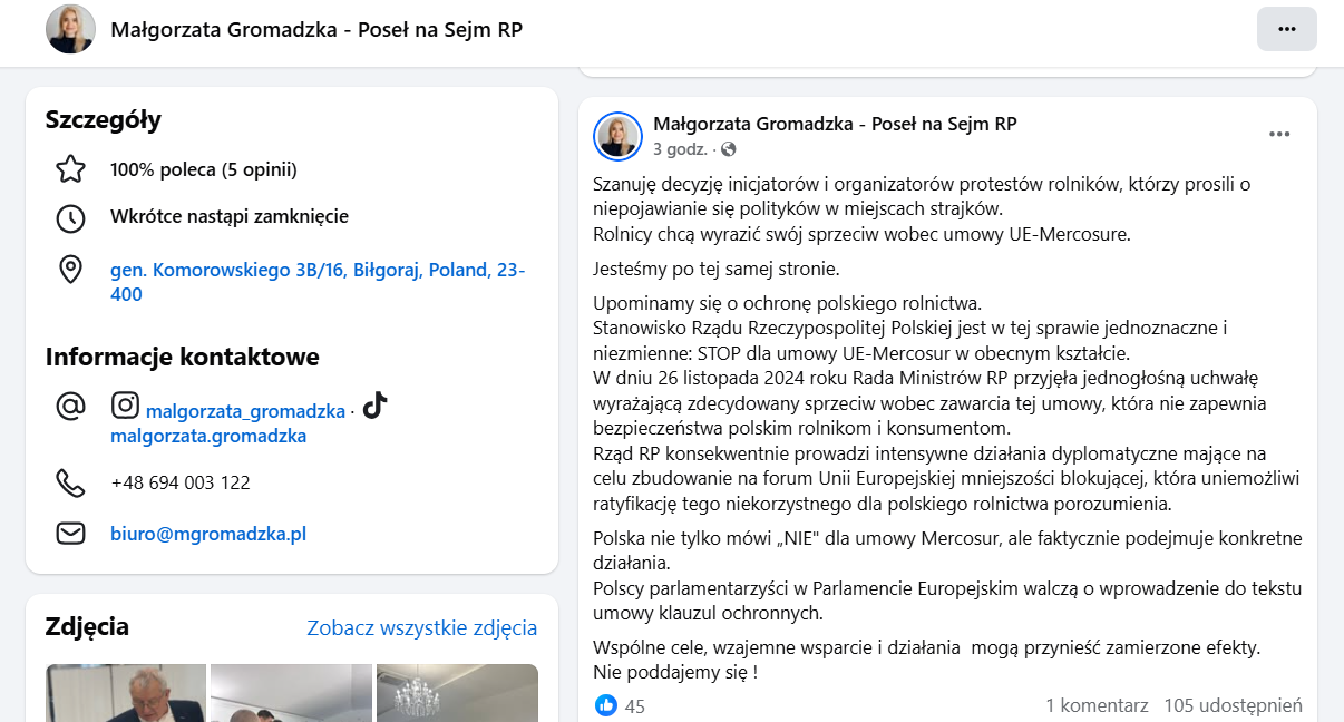 " upominamy się o ochronę polskiego rolnictwa" m. Gromadzka. Przez gardło nie przejdzie jej że stanowczo sprzeciwia się podpisaniu umowy Mercosur!!! Taka polityczna paplanina. Urszula zdecydowała! Donald ma podpisać! A posły mają mydlić ludziom oczy!