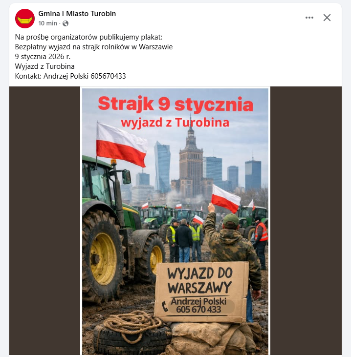 - Na prośbę organizatorów publikujemy plakat: Bezpłatny wyjazd na strajk rolników w Warszawie, 9 stycznia 2026 r. Wyjazd z Turobina. Kontakt: Andrzej Polski 605 670 433 - czytamy na stronie gminy Turobin na Facebooku.