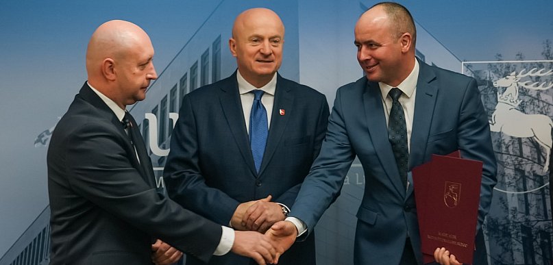 Marszałek Jarosław Stawiarski oraz wicemarszałkowie Piotr Breś i Marek Wojciechowski wręczyli 14 umów o udzielenie dotacji celowej na modernizację lub budowę dróg dojazdowych do gruntów rolnych.