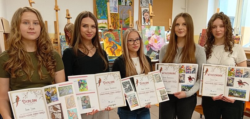 Uczestniczki zajęć plastycznych z najstarszej grupy "Tęczowej Malarni" oraz ich młodszy kolega otrzymali dyplomy i pięknie wydane katalogi nagrodzonych prac w XX Jubileuszowej edycji Międzynarodowego Przeglądu Plastycznego pn. „OGRÓD PIĘKNA, DOBRA I RADOŚCI”, który odbył się w Nowym Sączu.
